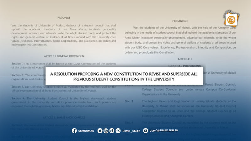After almost two years, the University of Makati 5th Student Congress, the highest policy-making body of the University Student Council (USC), has presented its proposed 2025 Constitution and By-Laws for the students of the University of Makati (UMak) through Resolution 2025-001: A Resolution Proposing a New Constitution to Revise and Supersede All Previous Student Constitutions in the University.